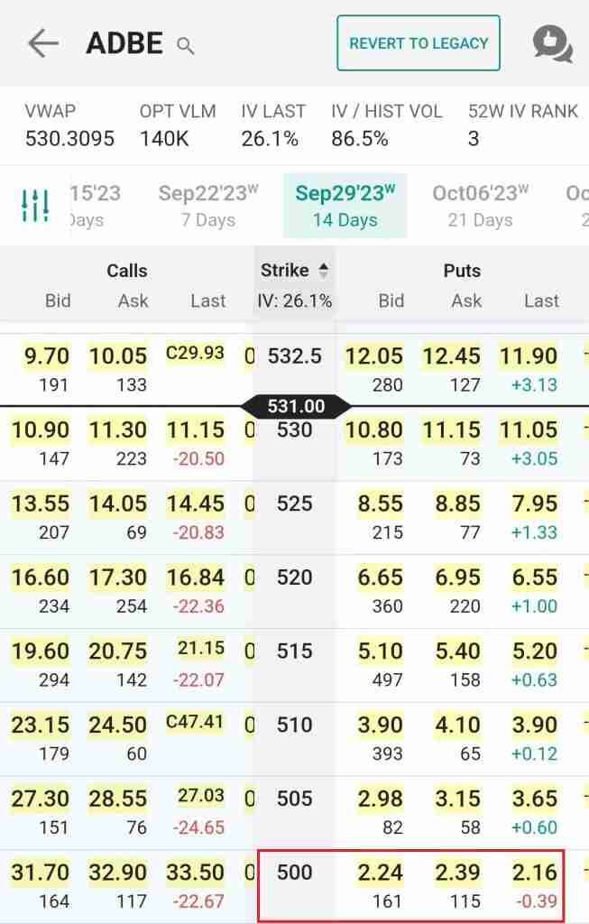 Returning to the Adobe example, on the day of the earnings release, the stock was down 5% at one point. Potential investors have the opportunity to sell an option with a strike price of $500, expiring in two weeks.